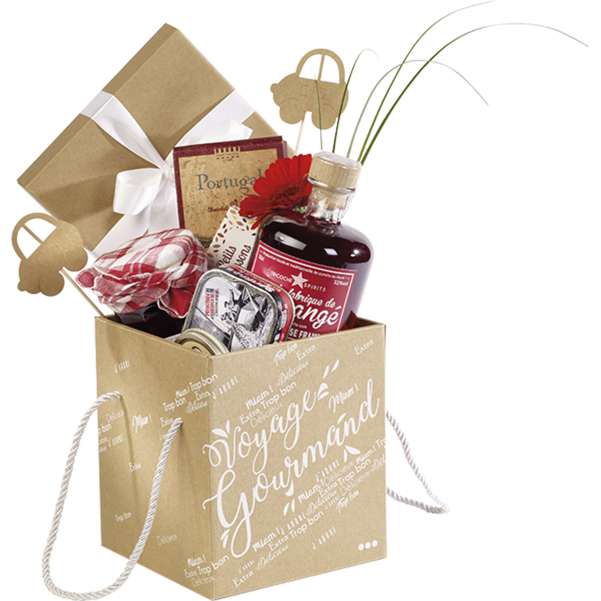Nos coffrets carré kraft carton "Voyage gourmand" sont idéal pour vos compositions gourmandes.