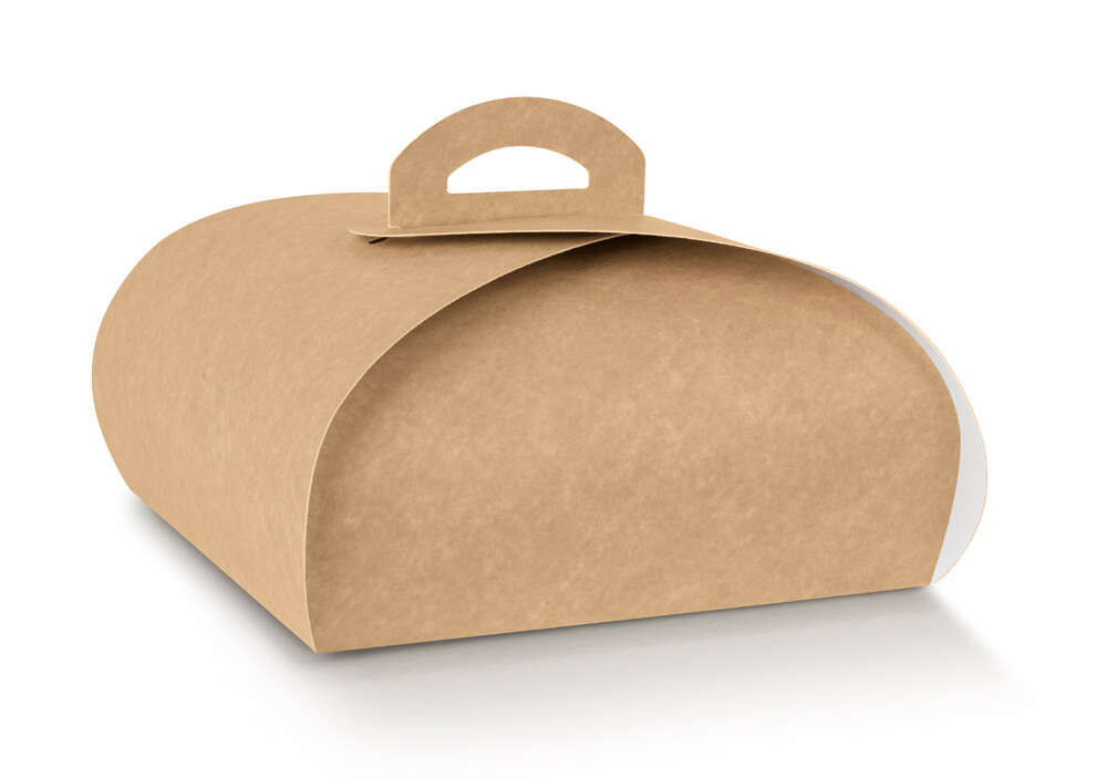 Boîte pâtissière en kraft naturel avec poignée intégrée, idéale pour transporter gâteaux et créations sucrées en toute sécurité.