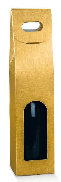 Boîte en carton contrecollé, munie d'une poignée et d'une fenêtre frontale, pouvant accueillir 1 bouteille verticale, modèle bordelaise ou bourguignonne.