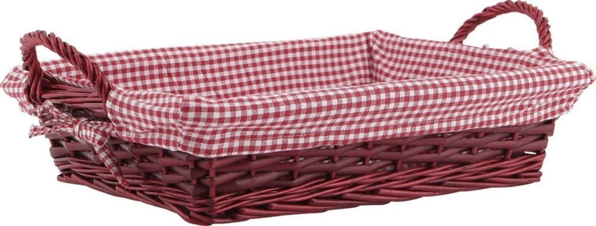 Corbeille en osier avec tissu décoratif à carreaux. Couleur rouge brique.