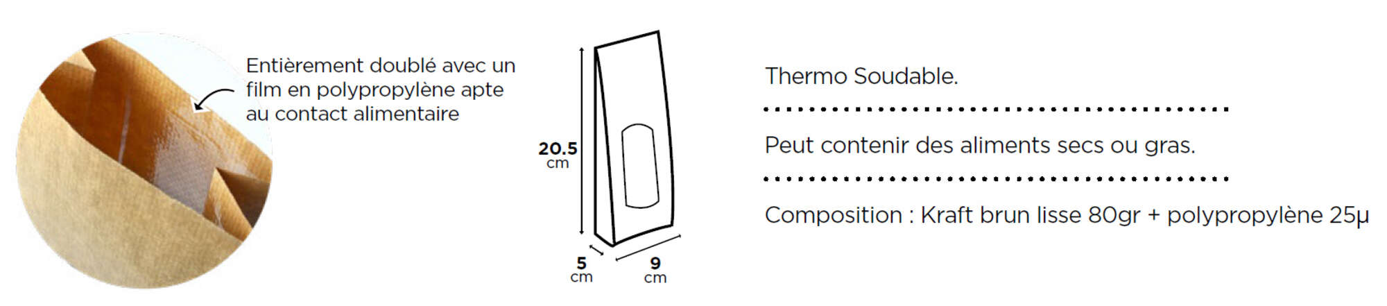 • Composition : kraft brun lisse 80gr + polypropylène 25 microns