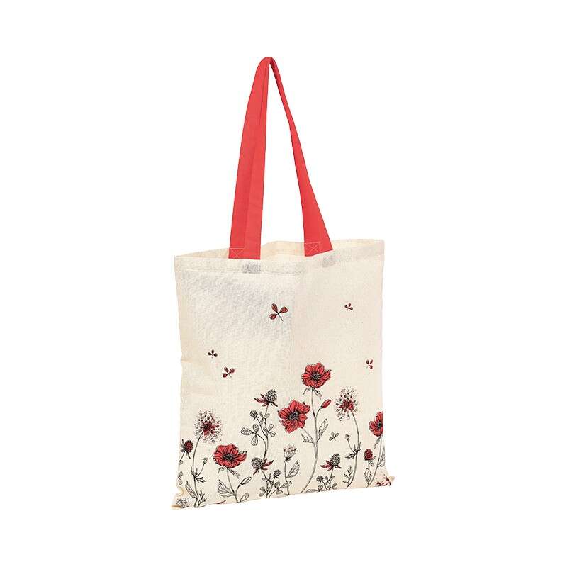 Sac en coton au motif floral rouge avec anses résistantes, idéal pour transporter vos produits avec style.