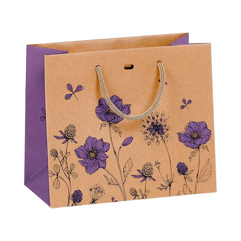 Sac cadeau élégant au motif floral violet avec poignées en corde, idéal pour sublimer vos emballages et présentations.